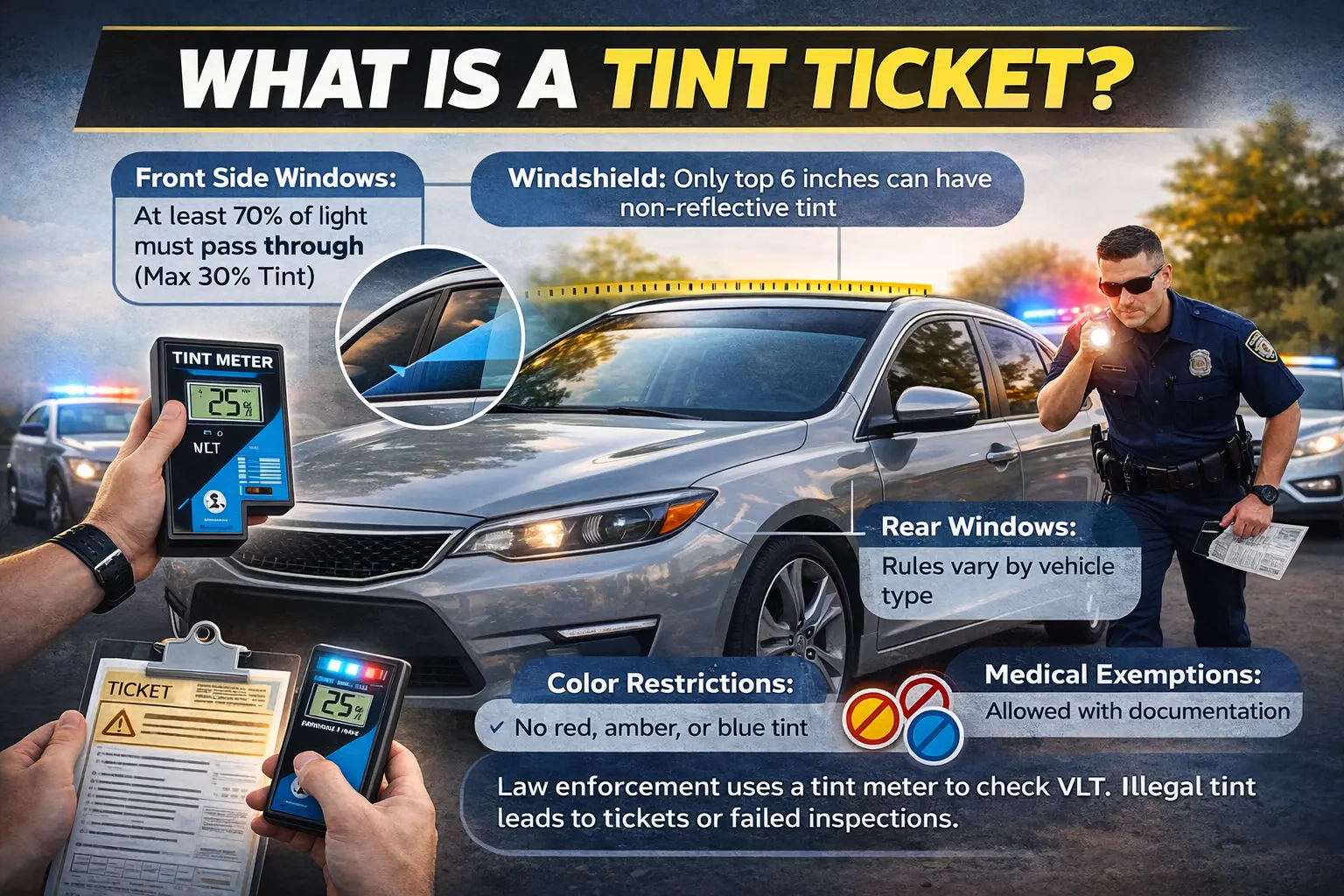 Law enforcement often measures tint with a tint meter, and failure can result in a ticket or failed inspection.