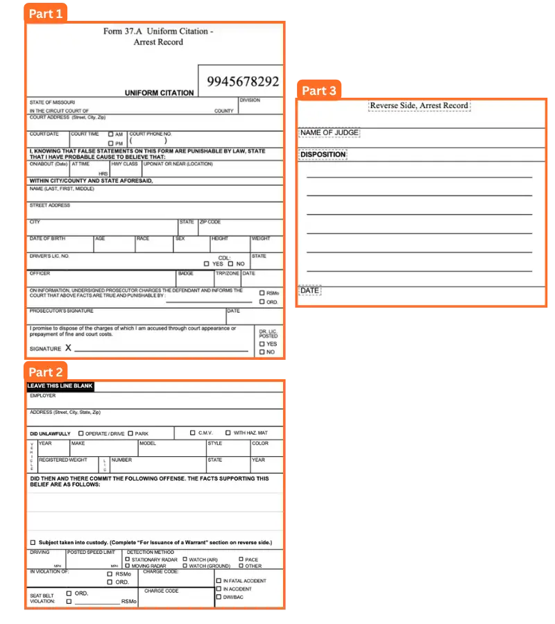 Part 3 documents what happened after the citation moved into the court system—including whether a warrant was considered, the court’s findings, the final charge classification, fines, sentencing, probation terms, mandatory insurance requirements, and whether points or penalties were assessed. Together, these parts form the complete legal record of the case, used by Missouri courts, law enforcement, and the Department of Revenue to update the driver’s record and enforce the outcome.
